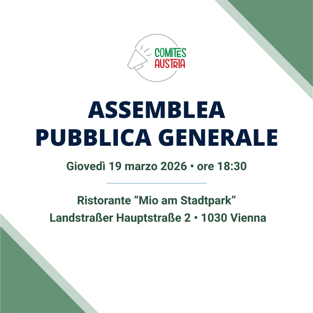 La prima assemblea pubblica generale del Comites Austria nel 2026 si svolgerà giovedì 19 marzo 2026 alle ore 18:30 presso il ristorante “Mio am Stadtpark” (Landstraße Hauptstraße 2, 1030 Vienna).